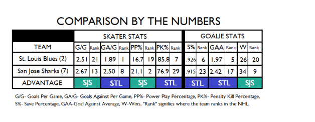 So often, playoff games come down to goal tending. That is what makes this an interesting matchup. On paper, it looks like the Blues have the obvious advantage. Both Halak and Elliott have had outstanding seasons, making them the most formidable goalie duo in the NHL. But don’t forget that the Sharks have a Cup winner in net with Antti Niemi. He hasn’t had the greatest season, but he has scorers in front of him that had the second best power play in the league. But ultimately, I believe defense will win out in this series and defense is the game St. Louis loves to play.
